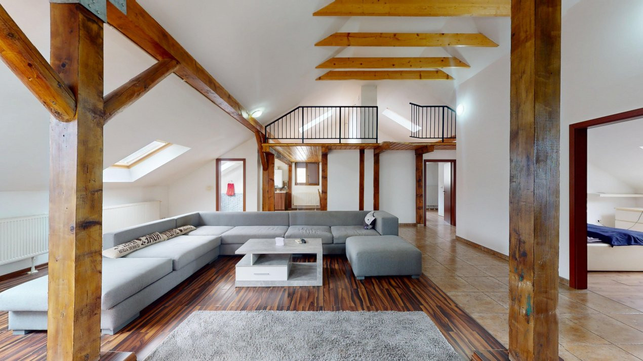 Un avantaj important este posibilitatea de a adăuga o scară interioară și de a transforma apartamentul într-un spațiu cu încă două încăperi suplimentare, ideal pentru o familie numeroasă, un birou separat sau un spațiu hobby.